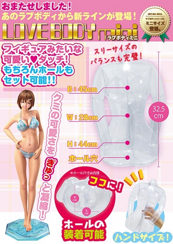 絶大な人気を誇るエアーダッチLOVEBODYシリーズから、コンパクトな「mini」が登場!全長32.5cmとサイズはコンパクトでも、ラブボディのクオリティはそのまま!美しいkumiのスリーサイズバランスを、ぎゅっと凝縮したパーフェクトボディです。もちろんホールの装着も可能ですので、お気に入りオナホールの固定用としてご使用下さい。