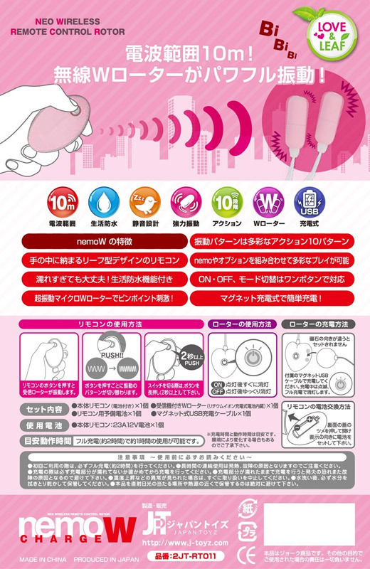 ●肌触りの良いピンクマット加工●手に馴染むリーフ型リモコン●ハート型の受信機付きツインローター●受信の最大距離は約10m●小型でも強力な10パターンの振動搭載●ワンボタンでON・OFF・振動切替可●便利なマグネット式USB充電ケーブル付属●約2時間のフル充電で約1時間稼動(受信機)●ローター部分のみ水洗い可。