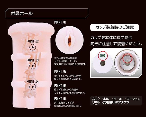 付属のホールはリアルな形状で、挿入口付近はヒダとイボのジョリジョリが貴男の息子を優しく刺激♪縦ヒダと横ヒダの肉塊とねっとり絡みつく快感、突く度に先端を襲うイボによるコリコリ刺激がたまりません!ご使用後はホールを取り外して洗浄可能♪電源はUSB充電式で、4時間の充電で約40分の連続使用が可能です。