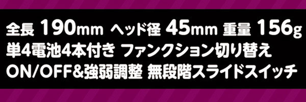 ●電池式のコードレスブラック電マ●取り外し可の固定用吸盤が付属●平らな場所ならどこでも設置可●シーンを選ばない生活防水仕様●角度自在のヘッド径は約4.5cm●1分間で約11000回転の強力振動●多彩な振動パターンは全12種類●強弱調整は無段階スライド式。