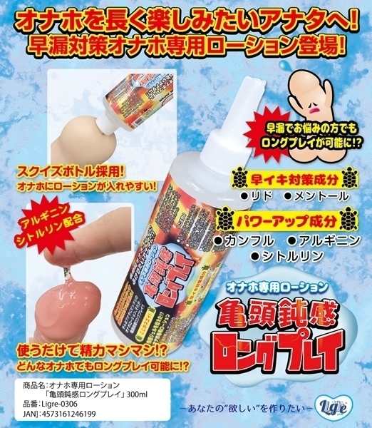 じっくり楽しみたい方のために開発された専用ローションです♪メントールやカンフルなどの成分を配合し、ひんやりとした使い心地を演出します!アルギニンやシトルリンなどのサポート成分も加え、快適な使用感を追求しました♪粘度はほどよく、さまざまなタイプのオナホールと相性よく使える水溶性タイプです!スクイーズ式ボトルを採用しているため、使いたい分だけを片手で簡単に注ぐことができます♪扱いやすく、清潔に使用できる点も嬉しいポイント!持久力に不安がある方や、プレイ時間を長く楽しみたい方にもおすすめです♪毎日のセルフケアをもっと快適に、もっと自分らしく楽しみたい方にぴったりの一本!シンプルなボトルデザインで保管や持ち運びにも便利です♪充実したひとときのために、ぜひご活用ください!