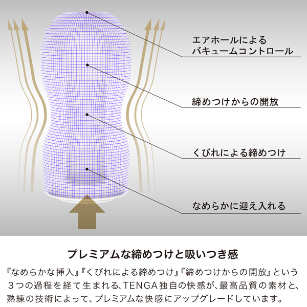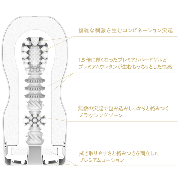 新たに設計された内部ディテール、高弾力に特別配合されたゲル、しっとりと包み込む高級ウレタンフォーム、拭き取りやすいプレミアムローション、その全てが高品質。
