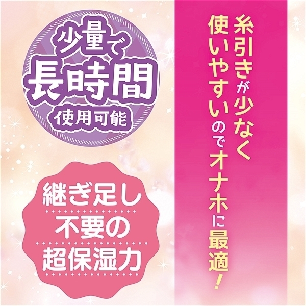糸引きが少なく使いやすい、オナホに最適!驚きの潤滑性&持続力で少量で長時間使用可能。継ぎ足し不要の超保湿力でねっとりヌルヌルがずーっと続く●天然潤い成分配合●安心の日本製●無香料
