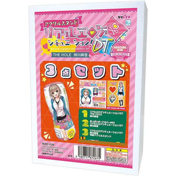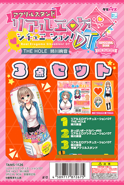 自宅スタジオ、リアルエロゲシチュエーション!DT公式コラボ商品。@リアルエロゲシチュエーション!DT THE HOLE 姉川絢音(TMT-1662)Aおっぱいボードカバー63 リアルエロゲシチュエーション!DT 姉川絢音(TAMS-1114)Bリアルエロゲシチュエーション! DT 姉川絢音 特製アクリルスタンドの3点セット。
