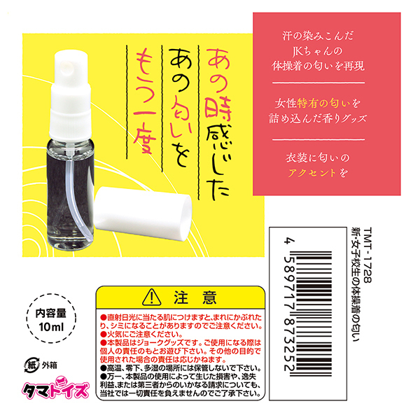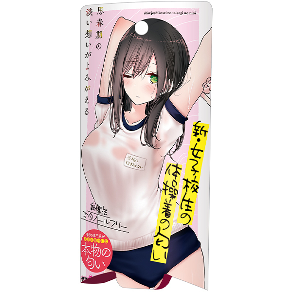 新製法エタノールフリー。汗の染みこんだJKちゃんの体操着の匂いを再現、女子校生の汗とフェロモンが混ざった芳しき香り、嗅覚で感じる女子校生の香り、思春期の淡い想いがよみがえる、匂いで感じる新感覚。あのとき感じたあの匂いをもう一度、女性の特有の匂いを詰め込んだ香りグッツ、衣装に匂いのアクセントを。