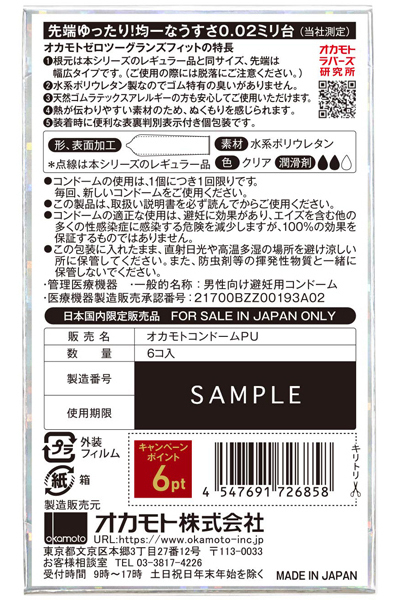 人気シリーズに先端幅広タイプが登場!根元から先端まで均一な薄さ0.02mm台のコンドーム(6個入)。