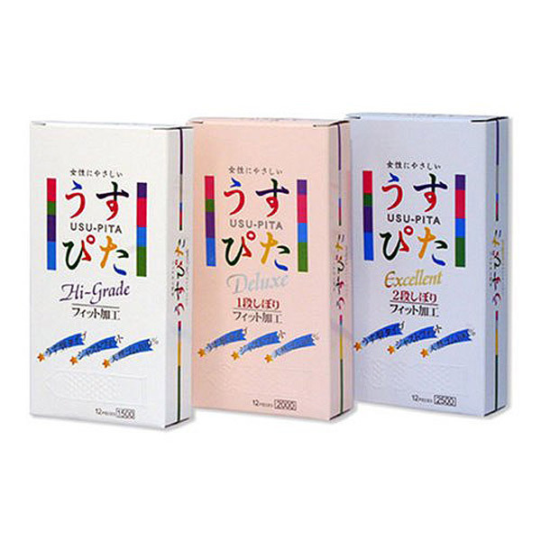 その日の気分で楽しめる!ジャパンメディカルのロングセラーコンドーム「うすぴた」シリーズ3種パック(各12個入×3箱)。超うす型ストレートの1500、カリ下一段絞りの2000、特殊二段絞りの2500、3種すべて三次元のツブ突起付き。脱落防止加工も施されたジャストフィットな使い心地の天然ゴム100%コンドームです。