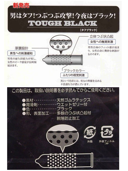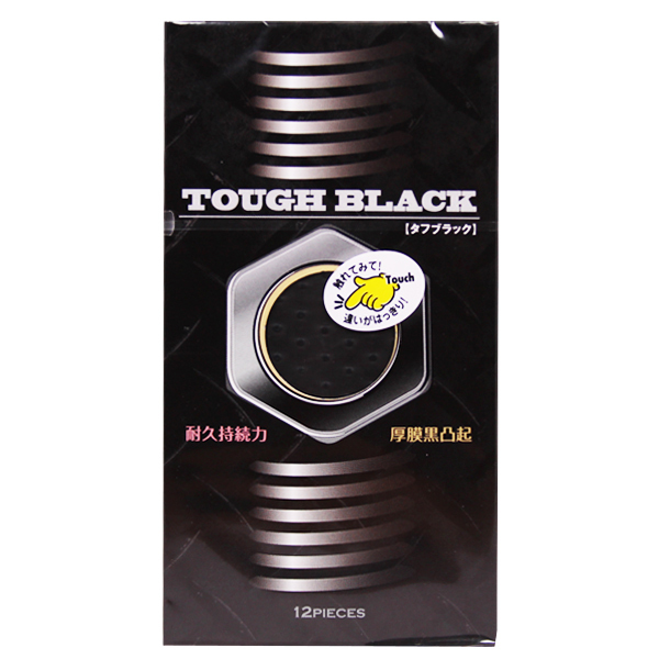 敏感君もタフな男に変身!ロングプレーが楽しめる新感覚コンドーム「タフブラック」12個入。立体つぶ状突起+厚膜設計で、タフさ=耐久持続力にとことんこだわったロングプレイコンドーム!変化をつけたい時やもっと激しく愛し合いたい時に最適。精悍なブラックカラーで興奮度もアップすること間違いなしのスキンです。