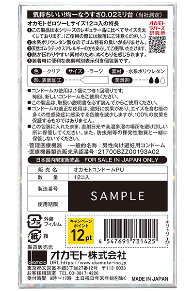 トップページ > コンドーム > サイズ(小・大) > オカモトゼロツー うすさ均一0.02 Lサイズ(12個入り)