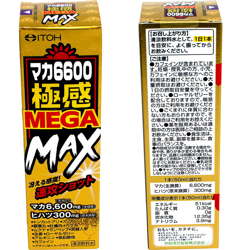 冴える感度!速攻ショット!?「マカ6600極感MEGA MAX 50ml」です。マカ6600mgとヒハツ300mgが入った製品。カフェインが入っているので敏感な方へのご利用はお避け下さい。