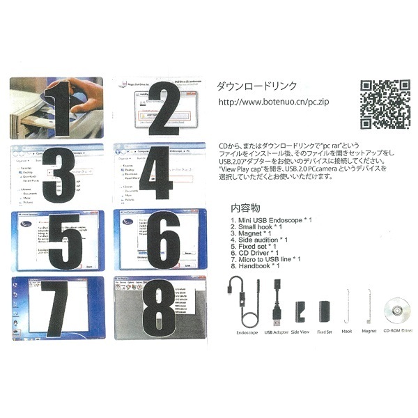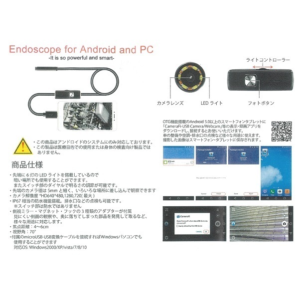 先端に6灯のLEDライトを搭載しており暗い場所でも使用することができます●またスイッチ部のダイヤルで明るさの調整が可能です●先端カメラ径は5mmと細く様々な場所に差し込んで観察できます●IP67相当の防水機能搭載で排水口などの点検にもご利用いただけます(スイッチ部は非防水)●側視ミラー、マグネット、フックの3種類のアダプターが付属し、見にくい側面の観察や奥に落ちた部品などを発見し取るなど様々な用途に対応します●集点距離4〜6cm、視野角70°●付属のmicroUSB-USB変換ケーブルを接続すればWindowsパソコンでも使用することができます(対応OS:Windows2000、XP、vista、7、8、10)