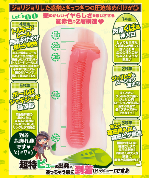 少し深めのくぱぁ構造は2段階の挿入刺激で初めて新幹線に乗るようなワクワクがいっぱい☆まるで電車のレールのような等間隔に細かく刻まれたギザギザ横ヒダ刺激、気持ち良さから脱線しない丁度いいトルネードレール構造!最深部は0式新幹線の鼻のようなまぁるい球状にジャギジャギしたリングヒダで終点!少し細めの形状でむっちむちの肉厚重量なのでジョリジョリした感触ときっつきつの圧迫締め付けが◎!超特ピューの出発であっちゅう間に到着(ドッピュー)です♪すぐに使えるローション付き