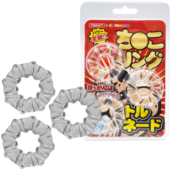 <T-BEST×KISS-ME-LOVE>夜もがんばリングで大人気のやわらかメンズリング「ち●こリング」が、トルネードになって新登場!今度のち●こリングは「特殊形状3個セット」!トルネードデザインのリングを3つもセットにしました!うずまき状に巻き付いた凹凸が伸縮率を高めてより効率的な装着感を生み出します。