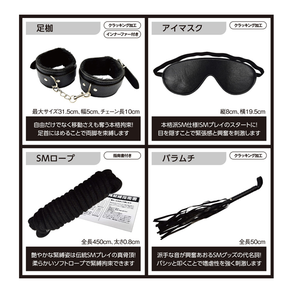 これひとつでSMプレイを網羅する豪華8点セット「SM∞」!SMプレイに興味があるビギナーなアナタにぴったりなSMグッズセットです。