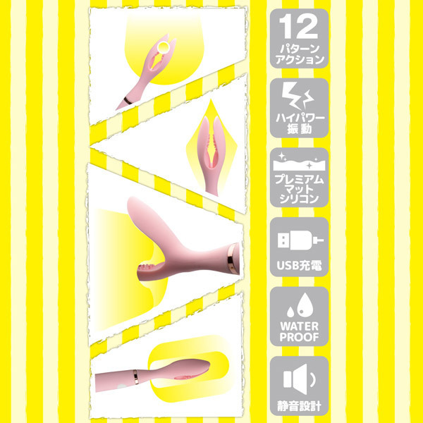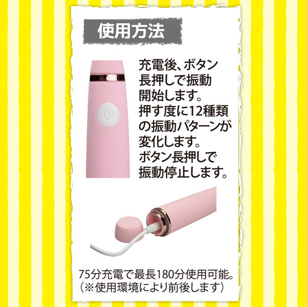 「当てる×挟む×挿れる」3つの楽しみ方で刺激も色々!肌に優しいプレミアムマットシリコン加工を施した高性能USB充電式ローター(ピンク)。強力振動&12パターンの振動アクション搭載!当てたり挟んだり挿入したり、バラエティに富んだ高防水&静音設計のサプライズシリコンピッチャー。75分間の充電で最長180分間の使用が可能(※使用環境によって前後します)