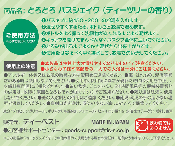 トップページ > ソープグッズ > 入浴剤(ローション風呂) > とろとろ バスシェイク (ティーツリーの香り)