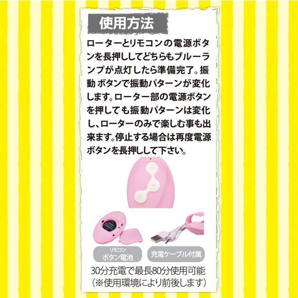 ショーツや指に固定して使えるベルト付きのUSB充電式ワイヤレスローター。10種類の振動アクション×最大8mの遠隔操作機能を搭載!肌触り滑らかなプレミアムマットシリコン素材を採用でIPX7の完全防水製。ローターにもスイッチが付いているため、単体での使用も可能!1人は勿論、パートナーと一緒に遊んで楽しもう♪リモコンはボタン電池を1個使用