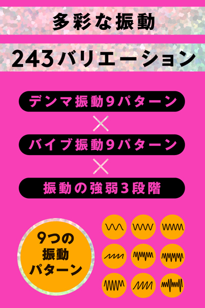 様々な女性の好みに合わせた9種の振動パターン&強弱3段階はソフトタッチな繊細振動からパワフル振動まで多彩な振動バリエーション!バイブ側にはヒート機能を搭載しています。