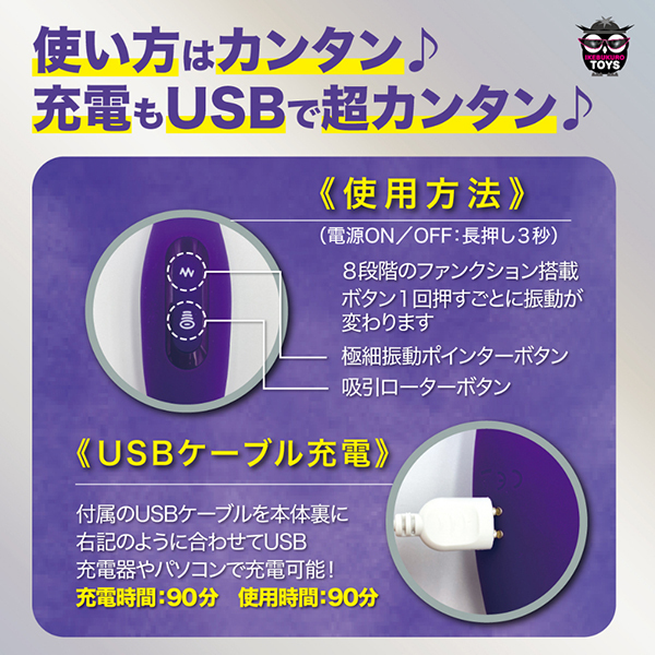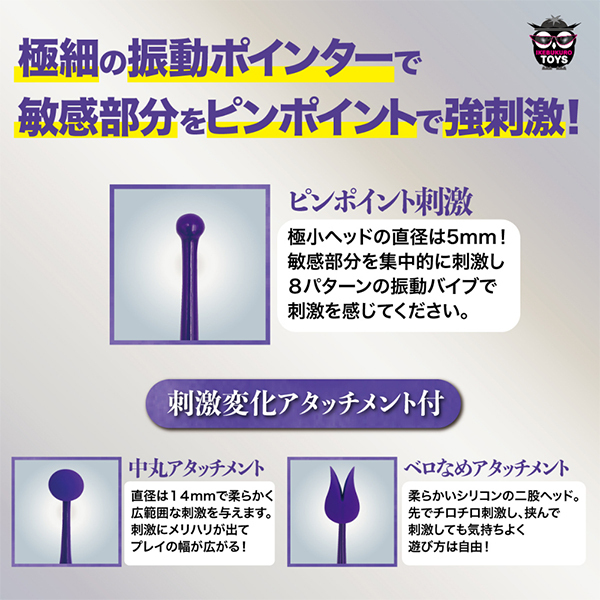 吸引と振動という2役でファンクションの機能を兼ね備えたジャストローターです。先端部分は直径5mmの極細ヘッド!2種のアタッチメントが交換可能で色んな刺激変化がお楽しみいただけます♪ピンポイントで吸って当てての集中的刺激が楽しめる吸引と振動機能の優れたローター♪IPX7の防水性能なので浅い水中での使用や、水洗いも出来て衛生的。充電時間や約90分で約90分の連続稼働が可能です。