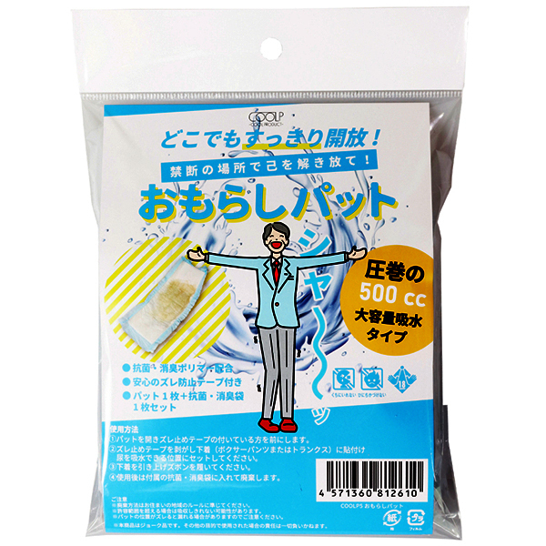 これさえあればどこでもスッキリ開放!禁断の願いを実現する「おもらしパット」でいつでもどこでも「おもらし」をすることが出来ちゃいます♪圧巻の500cc大容量吸水タイプ!多い日も安心で、抗菌消臭ポリマーを配合したパットになっているため、プレイ後の後始末も簡単です。