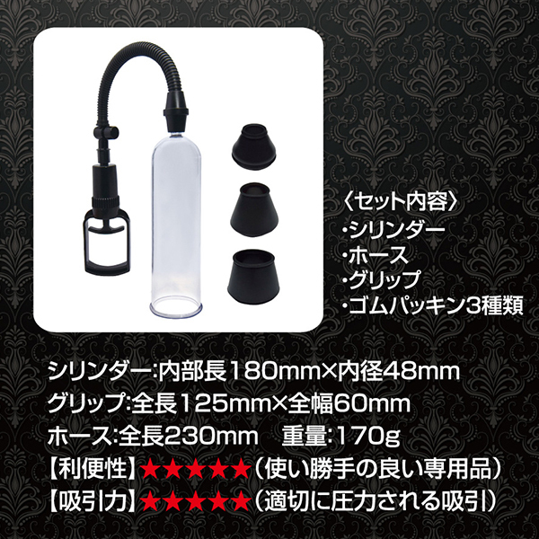 吸引でビッグになれ!強い男になるために開発された増大ポンプ「BIGBOY PUMP(ビッグボーイポンプ)」が新登場!簡単に片手で握れるトリガーレバーにワンプッシュの圧力開放ボタン、さらには大きさが目で分かる透明シリンダー、サイズが選べる3種類のゴムパッキンと操作性や視認性も抜群♪必要なものがすべて揃っていて、あとはレバーを握って空気を吸って、吸引圧力でメンズをビッグにするだけ!トリガーレバーは手動式なので微細な調整もコントロールも簡単♪圧力開放ボタンは安心設計でワンプッシュで吸引キャンセル!シリンダーは憧れサイズにぴったりな内寸長180ミリ×内径48ミリとなっています。