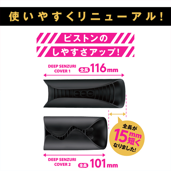 大人気「完全防水 DEEP SENZURI COVER」がパワーアップ!9パターン振動の最強ハイパワーローターを搭載し、全長を15mm短くすることでピストンのしやすさを格段にアップ♪柔らかシリコン仕様なので握り方の強弱でどんな形にもピタッとフィットするのが嬉しいポイント!驚異的なハイパワーだから実現する振動エクスタシー♪強弱を含む9種類の振動パターンが裏スジをブルブルと刺激しつつ横ヒダとイボが射精感を高めてくれます!完全防水IPX7等級。