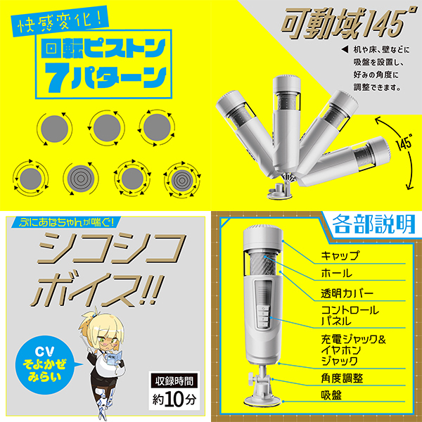 シンプルボタンでラクラク操作!ホールを取って洗うだけ、後処理簡単!ちょうどいいサイズ感で、手持ち操作も可能!ぷにあなちゃんが喘ぐシコシコボイス収録(CV:そよかぜみらい)!パッケージイラスト:maruku