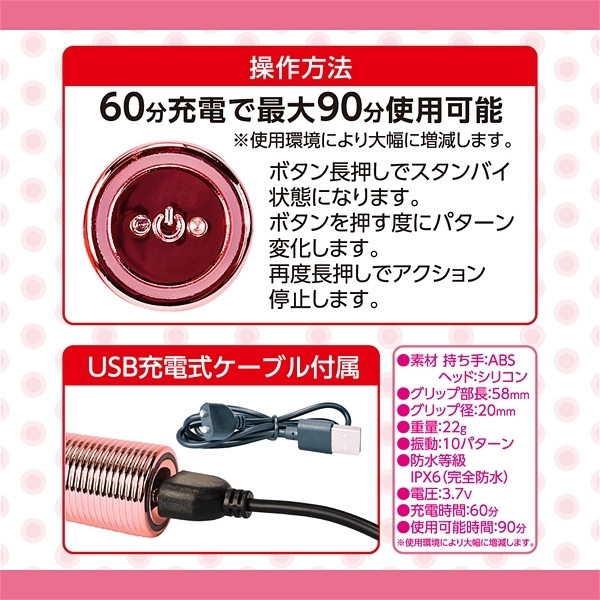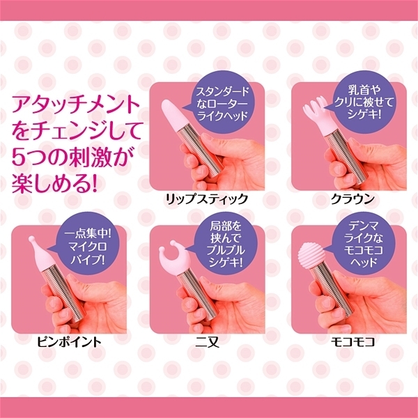滑らかなシリコンヘッドはローターライクな使い方が楽しめるリップスティックタイプと乳首等を挟んで刺激出来るクラウンタイプ、一点刺激が楽しめるピンポイントタイプ、局部を挟んで刺激する二又タイプ、デンマライクに楽しめるモコモコタイプの5種類。