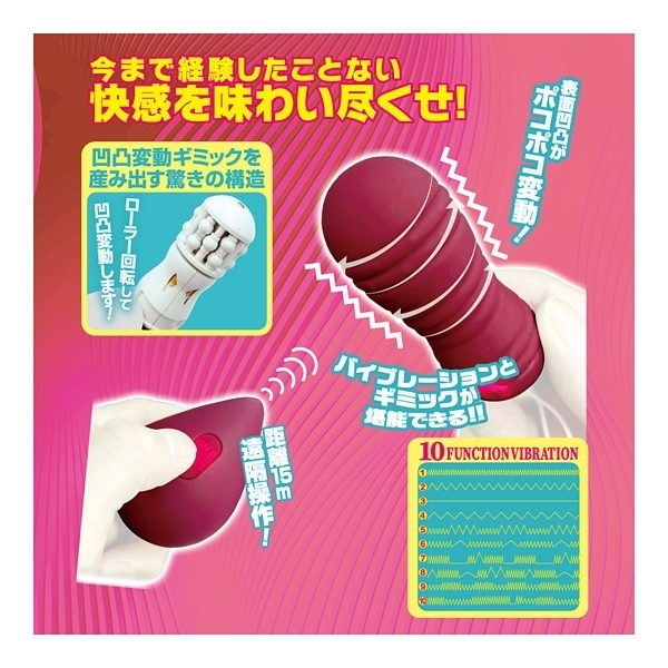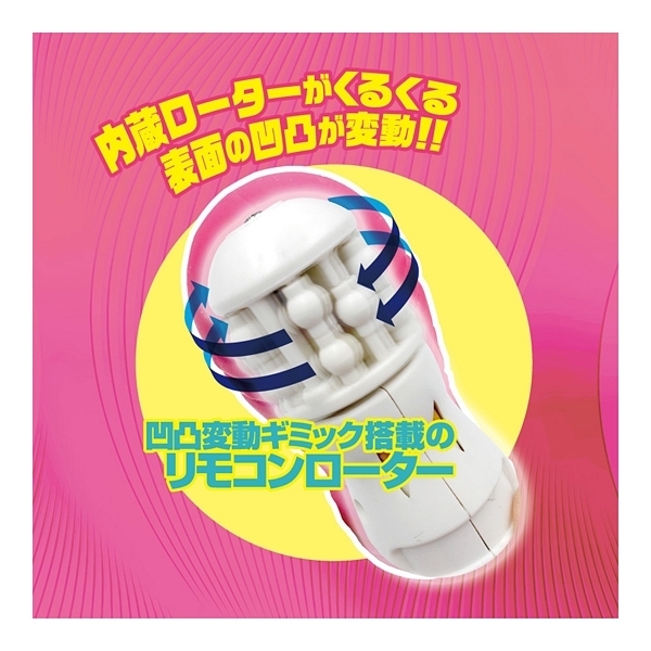 ただ震えるだけじゃない!特殊な機巧アクションが遠隔操作で楽しめる、新しいワイヤレスローター「リモコンギミック」!ワインレッドカラーの「ローラー」は、表面の凹凸が変動するローラーギミックを搭載!小さなボディながらも、内蔵ローラーが回転するアクションで、表面凹凸がポコポコと変動します。