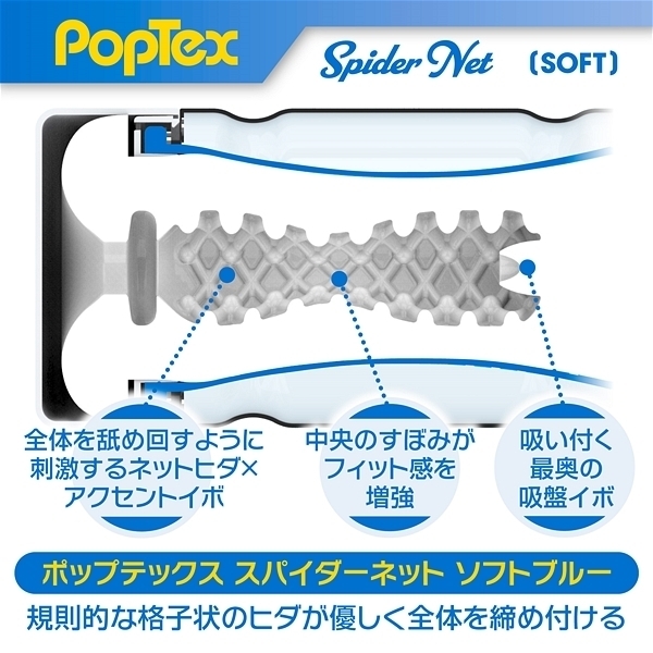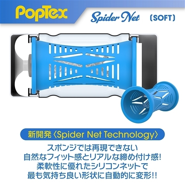 ポップテックススパイダーネットカップソフト<リアルな締め付け×ネットヒダ刺激の高機能カップホール>新開発SpiderNetTechnology搭載型カップホール!ホールを包み込む柔軟性に優れたシリコンネットで最も気持ち良い形状に自動的に変形することでスポンジでは再現できない自然なフィット感とリアルな締め付け感を実現しました!内部構造は網目状のネットヒダの中心にアクセントのイボ刺激のアクセント!強力に吸い付く最奥のバキュームスポットは天面の「OneWay」シールを剥がし空気を抜いて挿入することで内部のまとわりつき感をより楽しむことが出来ます。