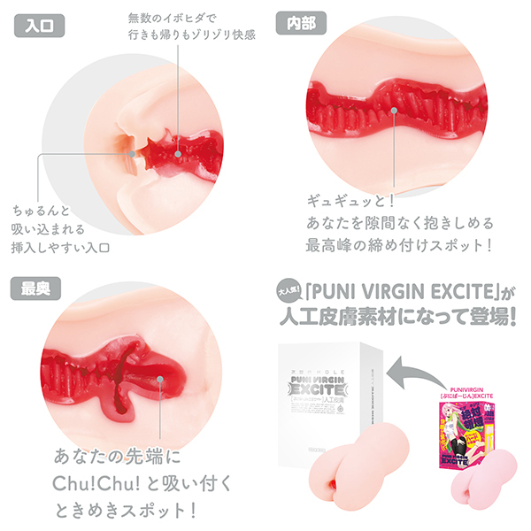 『ぷにばーじんシリーズ』にギュギュッと締まる高刺激の『ぷにばーじんEXCITE』が人工皮膚素材で再登場!!よりリアルな肌触りと生の挿入感で気持ちよさUP!ヒダとネジリよる絶対領域があなたを激しく絡み付く気持ち良さをお楽しみください。人工皮膚素材と国産素材&国内生産で伸縮性抜群の高い耐久力と嫌なニオイしっかり除去。