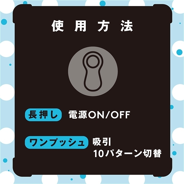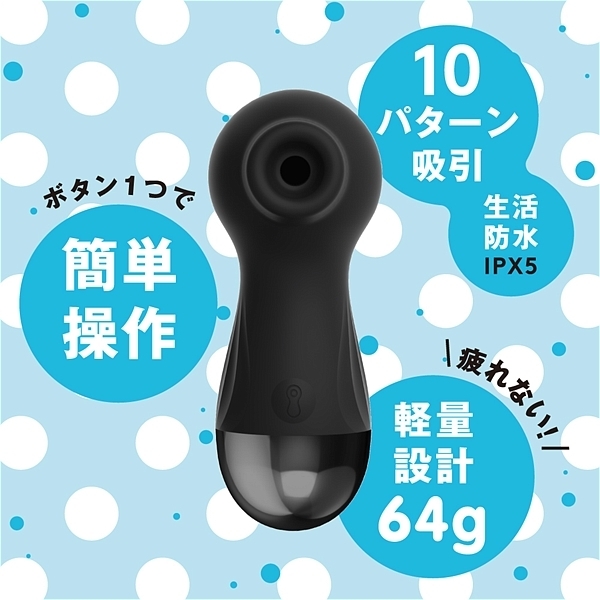 「はじめて」の人に選んでほしい。コンパクトボディでもしっかりイケる、強力吸引10パターン。手が疲れない軽量設計64g。ボタン一つで簡単操作。USBポートに差し込むだけのラクラク充電。生活防水IPX5。●カラー:ピンク