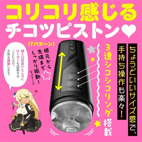 コリコリふるえるチコツピストンの電動オナホ!3連シコシコリング搭載のコリコリピストン7パターン!多彩なパワフル振動7パターン!ホールは直接肌に触れるものだから、安全性と感触にこだわった高品質なエラストマーを使用しています。