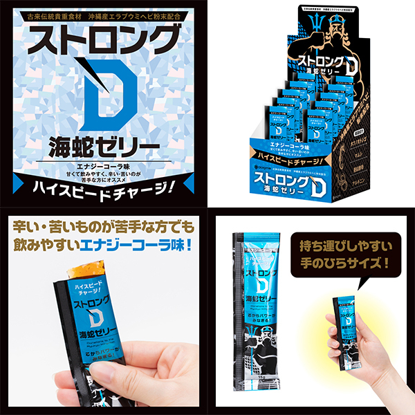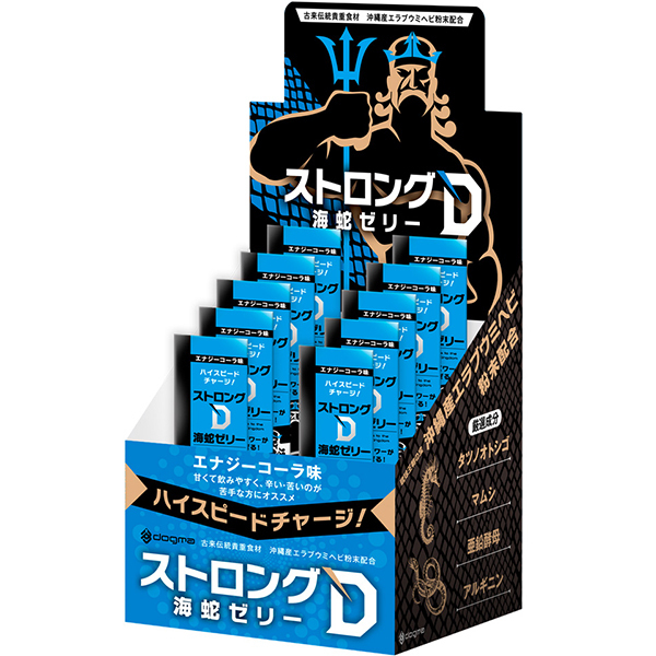ハイスピードチャージで芯からパワーがみなぎる!琉球地方古来より、伝統的高級食材として珍重されたエラブウミヘビの圧倒的な滋養力を基に開発された、大人気「ストロングD海蛇」シリーズからゼリーverが登場!アミノ酸42種類・ビタミン・ミネラルが豊富なウミヘビ成分&相性の良い厳選成分に「マムシ抽出液、タツノオトシゴ抽出粉末、亜鉛含有酵母エキス、アルギニン」を贅沢に組み合わせて配合。