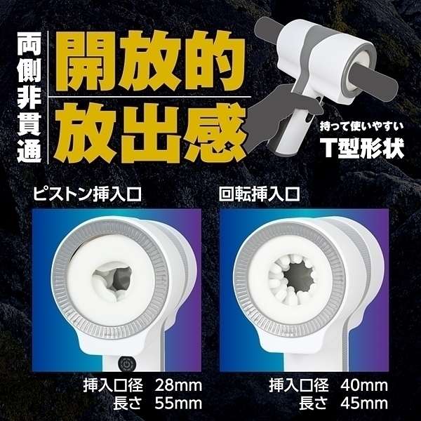 回転刺激の挿入口とピストン+振動刺激を味わえる挿入口の両側で楽しめるハンマー型電動オナホール。