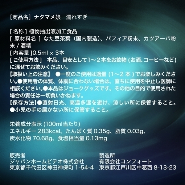 セクシー業界で話題沸騰中、女優も男優も大絶賛「ナタマメ茶」のエキスを配合したリキッドサプリが登場!スッキリした味わいで、ドリンクに混ぜれば気付かないくらい…でも悪用厳禁!他の追随を許さない潤い感がみなぎり、汁だくぐしょぐしょ大洪水!ベッドが水びたしになっては大変、必ずタオルをご用意ください!
