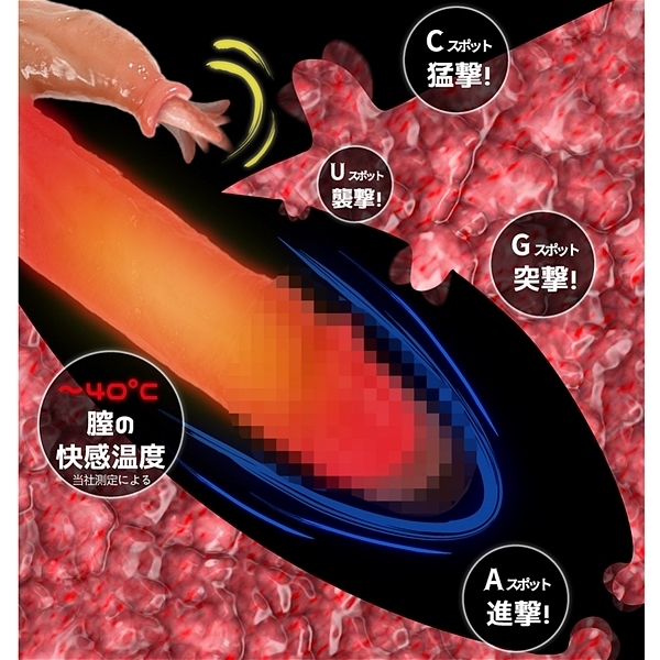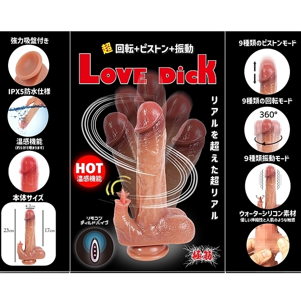 ピストン+回転+振動+温感のディルドバイブが登場!9種類回転ピストンx9種類振動=81種類パターン!!約40℃の膣内快感温度まで加熱できます。人肌のような触感のウォーターシリコン素材採用!IPX5防水仕様、強力吸盤付き。充電はUSBで簡単充電。