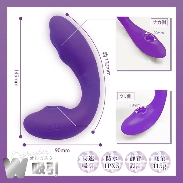 Wで吸う。新構造吸引システム−エアバルブ方式−でク●イキ・ナカイキ連続ゼッチョウの嵐を巻き起こす。USB充電式。軽量・静音設計、シリコン製の柔軟に曲がるフレキシブルネック。防水(IPX5)仕様でお手入れ簡単。●カラー:パープル