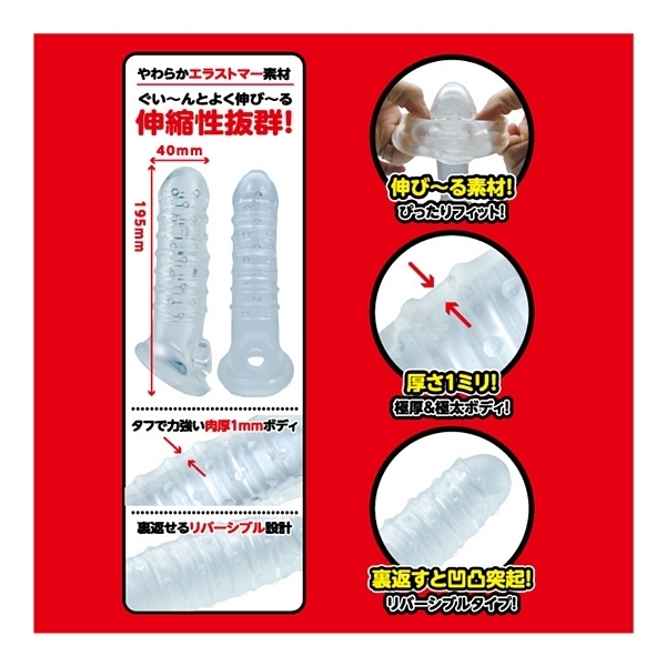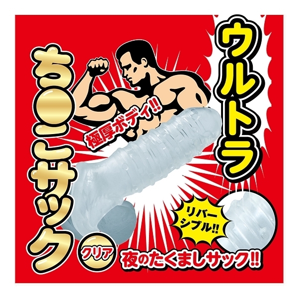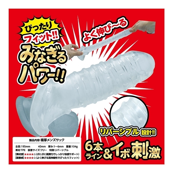 夜もがんばリング、で大人気のメンズパワーアップアイテム「ち●こリング」シリーズに、ウルトラでマックスな極厚サックが新登場!今度の「ち●こサック」は、フル装着する超メンズサック!肉厚1〜6ミリからなる極厚ボディが、貴男をウルトラなメンズにパワーアップさせる!パートナーを思うからこその、大きくて太いストロングスタイルなサックなのです!ぷにぷにっとした柔らかなTPE(エラストマー)素材は、ぐい〜んとよく伸びる高伸縮性!サイズ問わずでどんな大きさでもしっかりフィット、抜群の装着感&締付感!外側には、アクセントになる横縞6本ライン突起!内側には360度ぐるっと配置された丸イボ突起!貴男もパートナーも快感を味わえる両面仕様、くわえて裏返しても使えるリバーシブル設計!「クリア」タイプは、生身がしっかり透ける透明色!この大きくて太い極厚サックで、ウルトラでマックスなメンズにビルドアップ!みなぎるパワー!