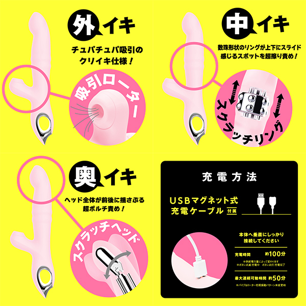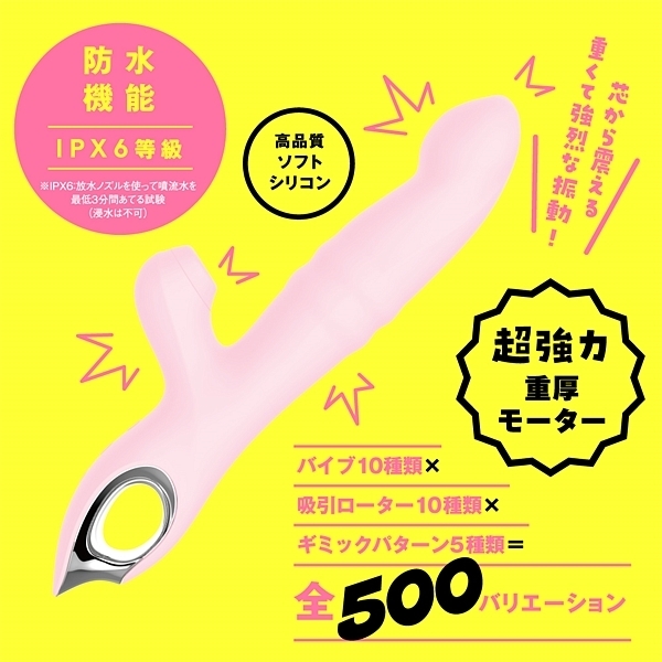 気持ちイイとこ全部責め♪究極ギミック搭載で奥イキ・中イキ・外イキ革命!ヘッドが前後に揺さぶり超ポルチ責めするスクラッチヘッドギミック!数珠形状のリングが上下にスライドし、感じるスポットを超擦り責めするスクラッチリングギミック!チュパチュパ吸引でクリイキ仕様の吸引ローター!バイブ振動10種類に吸引ローター10種類、ギミックパターンが5種類で脅威の全500バリエーションで楽しめます。