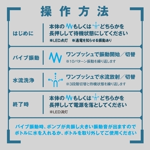 ソフトからパワフルまで3段階に切り替え可能!放水刺激でアナの外から中から恍惚快感♪使い方イロイロ!洗浄だけじゃない!『激震バイブ』機能は細身で引き締まった激イキ振動!グラインドネック仕様で前後左右に約45度傾きお好みの向きに調整可能!一度に440ml貯量できる大容量ボトル!お湯も使えます!(40℃まで)ボタンを2箇所に配置しハンドルの持ち方を変えてもシッカリ操作可能な楽々操作Wボタン。