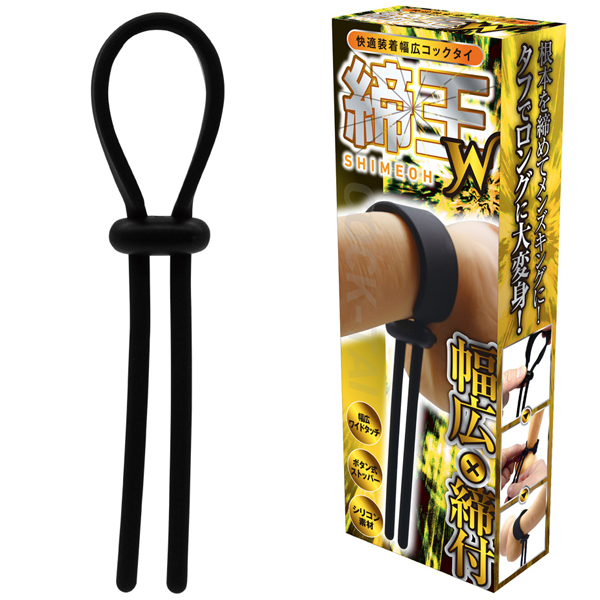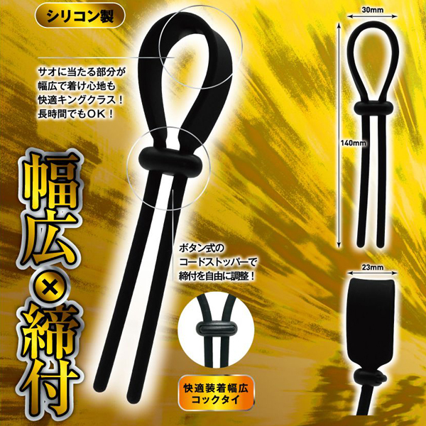 根本を締めてメンズキングに!快感キングクラスのコックタイ、「締王」!根本に巻きつけて、ネクタイのようキュッと締めれば、まるで王者のような貫禄に大変身!締め付け部分のコードストッパーは、自由に調整できるボタン式!本体素材は、肌触りがよいシリコン製!締め付ければ、もう貴男はまさにメンズキング!タイプ「W」は、「WIDE」の「W」!サオに当たる部分が幅広仕様で、快適な着け心地のコックタイです。