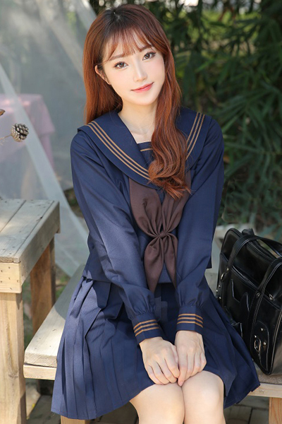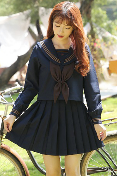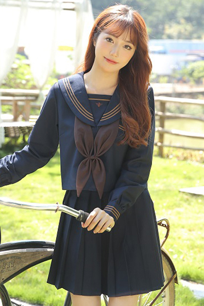 茶色の3本ラインでシャープな雰囲気を出しつつ、大きめのスクールリボンでアクセントをプラス♪ネイビー×ブラウンのカラーリングでシックに仕上げた一着です。